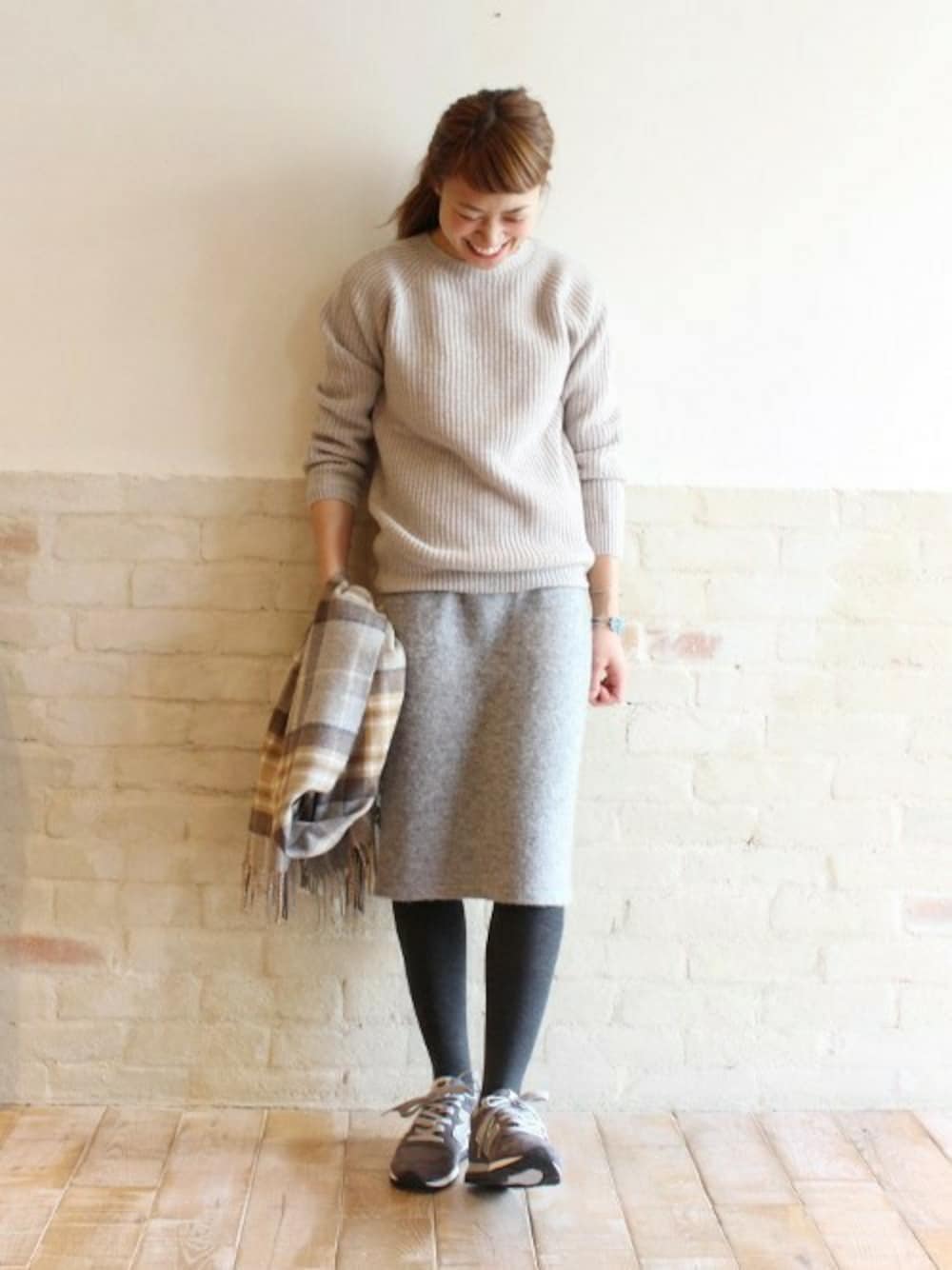 上質なジーロンラムを使用したHarleyの畦ニット。 軽くてとっても暖かく、しなやかなのが魅力です。 柔らかなベージュとグレーでストールの色とリンク! 足元は復刻新色のNewBalanceM996で、鉄板のスニーカーコーデ。