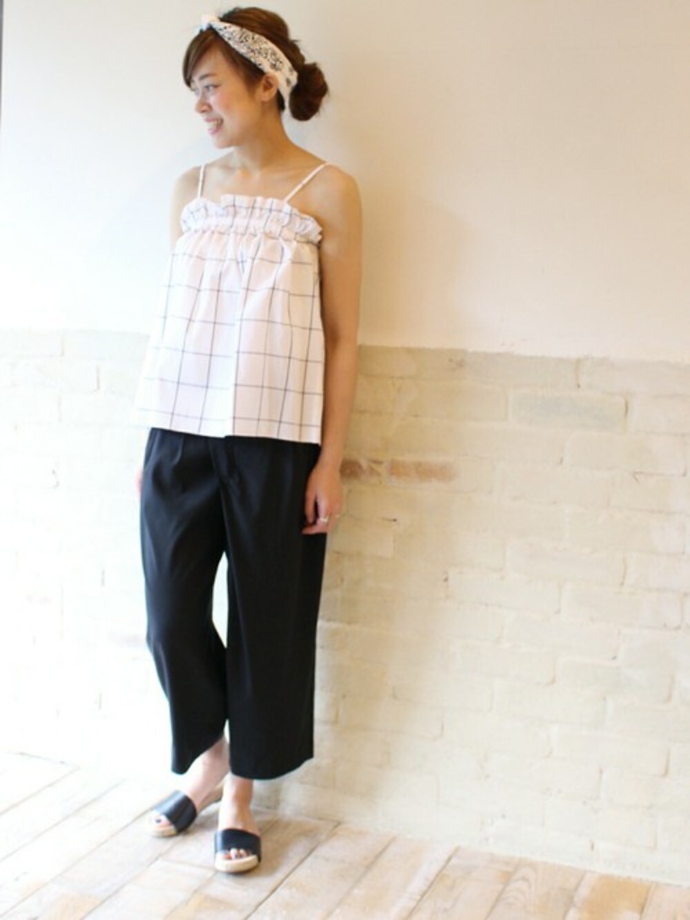 レトロなチェックキャミソールは潔く一枚で。 モノトーンだからこそできる大人な可愛さを感じさせるコーディネートに。