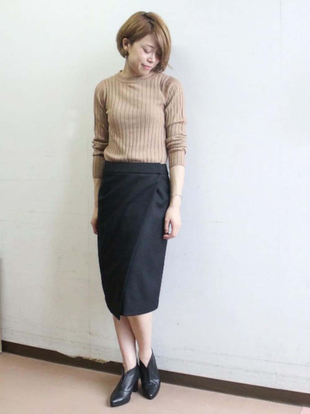 キャメル×ブラックで大人っぽく。 タイトスカートはトレンドのラップデザインで表情をつけて。