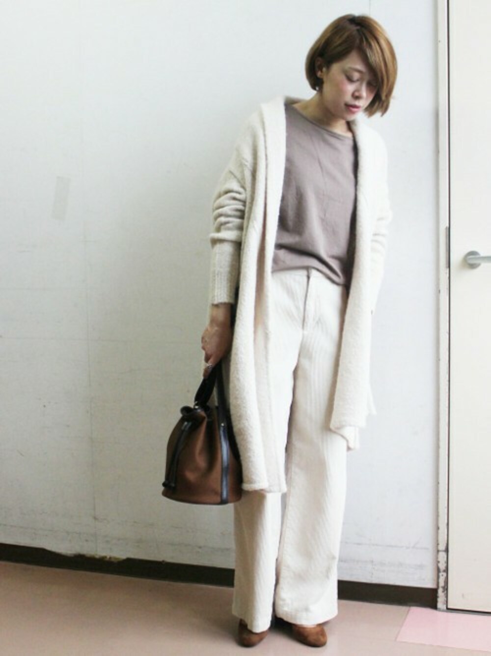 もこもことボリューム感がかわいいコーディガン。 生成~ブラウンのワントーンでまとめて、大人っぽく。
