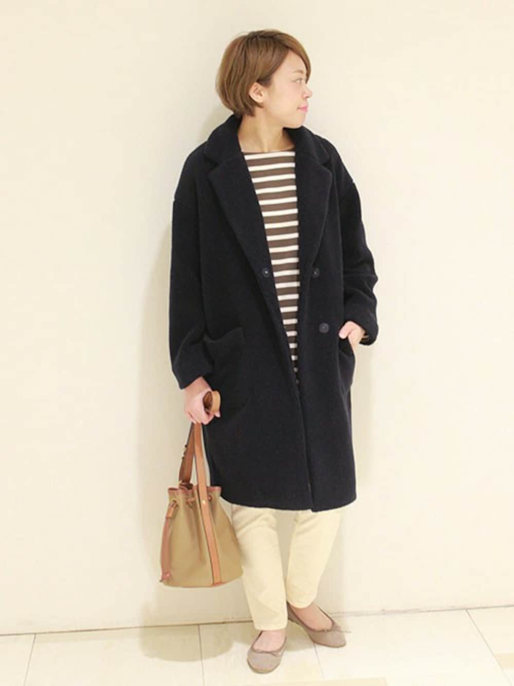 カジュアルなボアのコートは、ボーダーと合わせてデイリーユースに。見た目より軽くあたたかな着心地で、冬中活躍しそう。