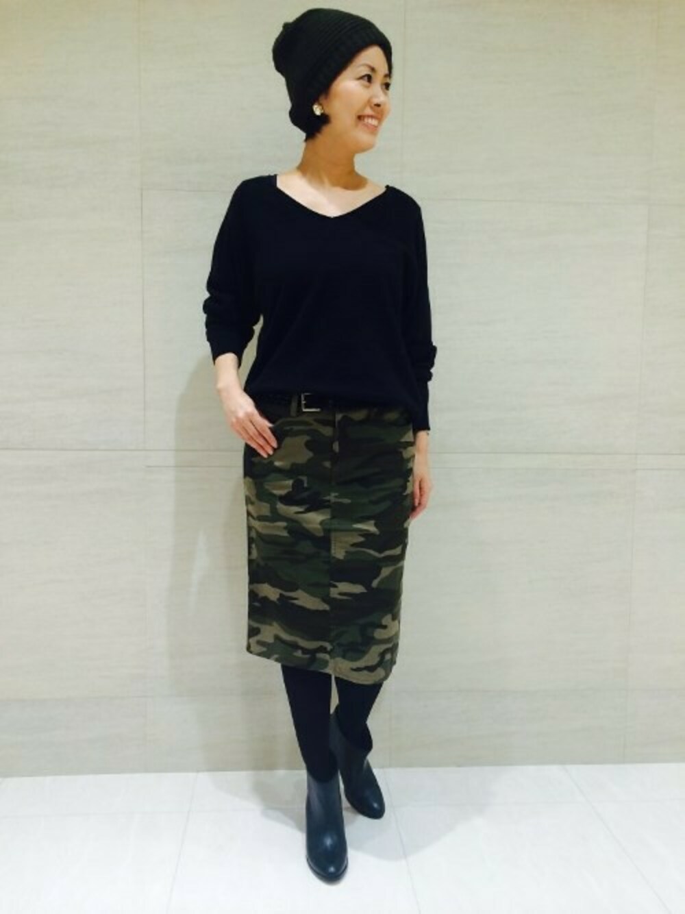 カモフラ柄のスカートを黒でシックにまとめたコーディネート★ひざ丈のスカートはミリタリー調でも落ち着いた印象に。シーズンレスで履ける素材感もオススメポイント!