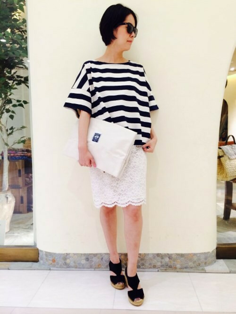 ワイドシルエットが可愛い太ボーダーのTシャツにレースをミックスさせれば、ぐっと女性らしい雰囲気に♪色を統一させればまとまります!
