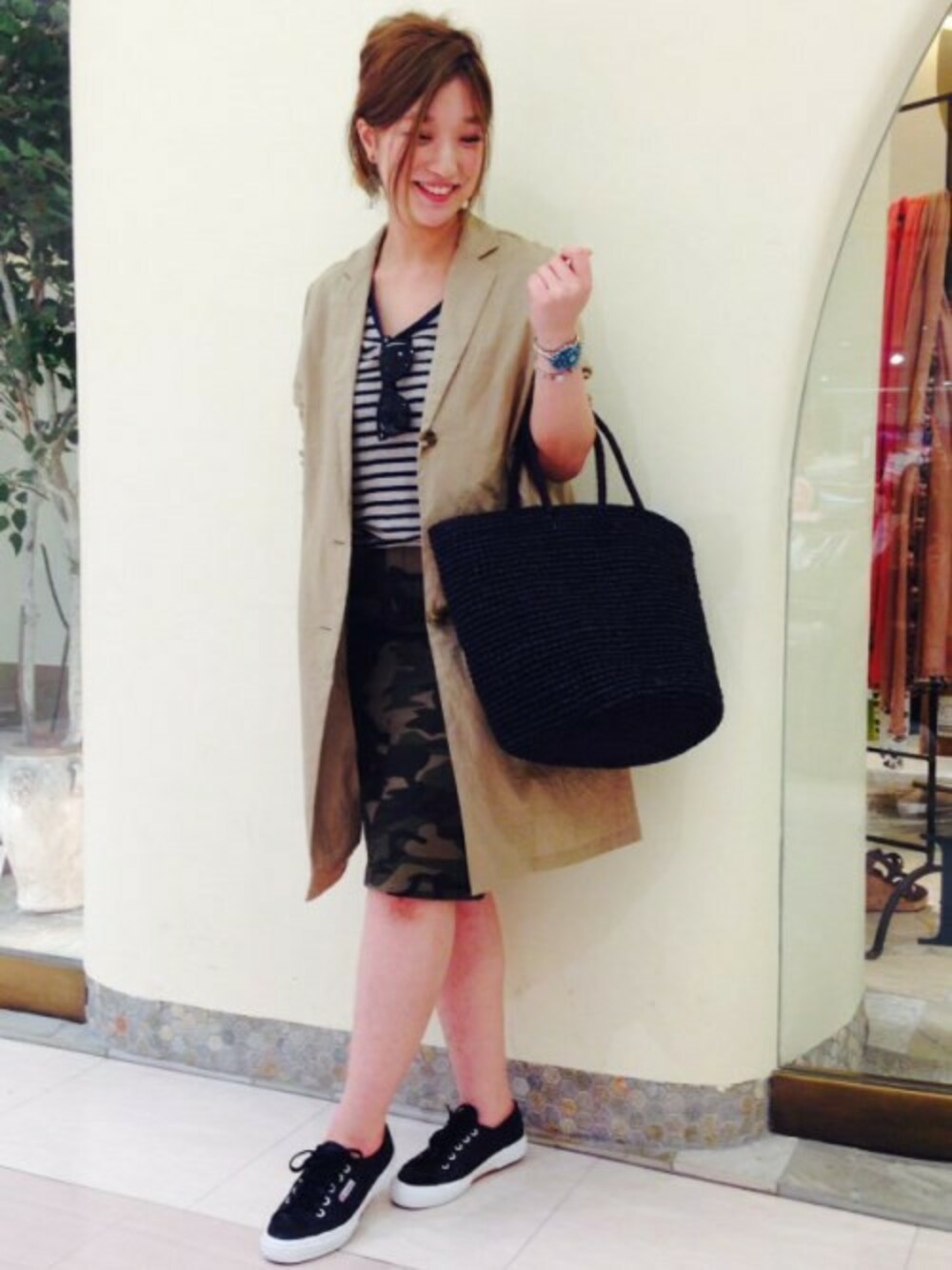 ボーダーとカモフラの柄わせが可愛いスタイリング!軽い着心地のリネンコートは長く着られる1着♪黒の小物でシックにまとめました!