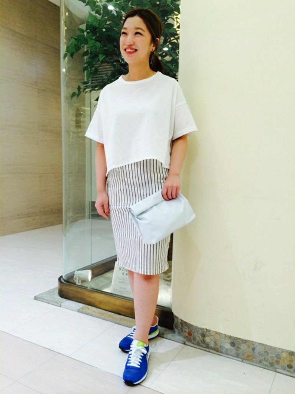 今年らしいメッシュ素材のショートトップスには夏らしいリネンのストライプスカートわせて女性らしい着こなしに。全体を白いトーンでまとめることでカジュアルですが大人っぽい雰囲気に♪