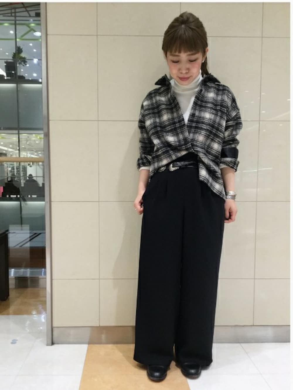 モノトーンスタイル。シャツをベルトでアレンジ。