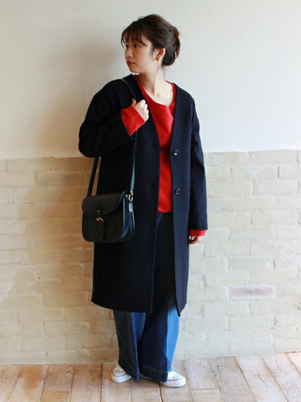 シックな雰囲気のVネックコート。1枚持っておきたいデザインですね!発色の綺麗な赤をさして明るい印象でメリハリのあるスタイリングに。