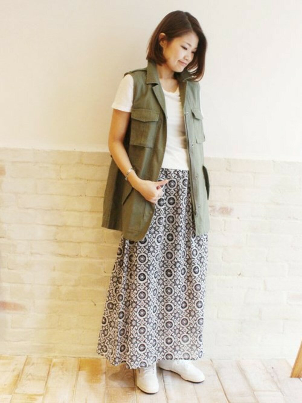 メンズライクなワークベストは、ヴィンテージみたいな雰囲気のロングスカートで ラフに着こなし。