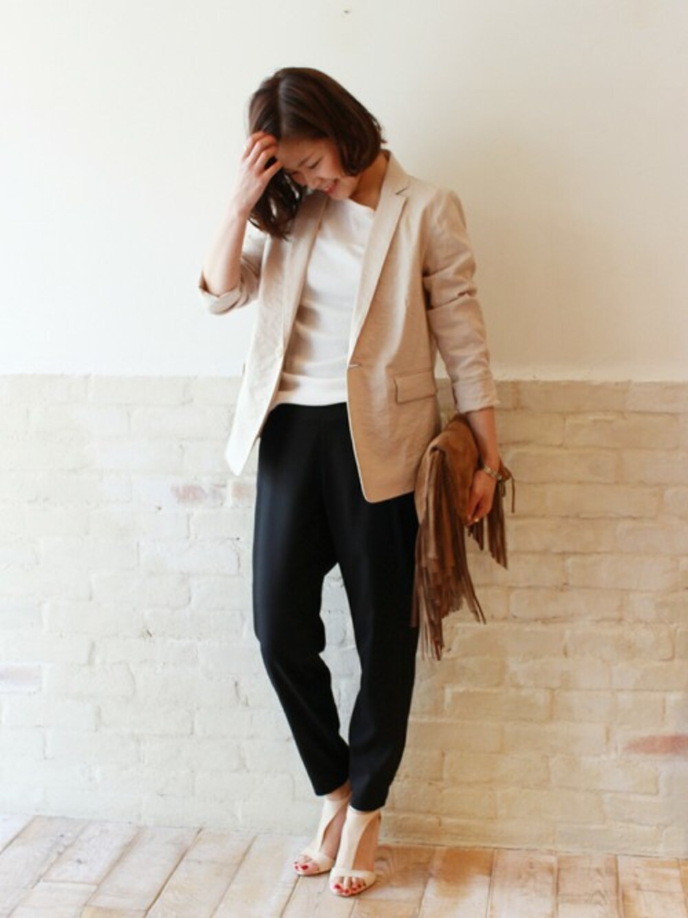 今着るなら、清涼感のあるベージュのジャケット。 ジョガーパンツみたいな技ありボトムをあわせても、上品さをキープしてくれます。