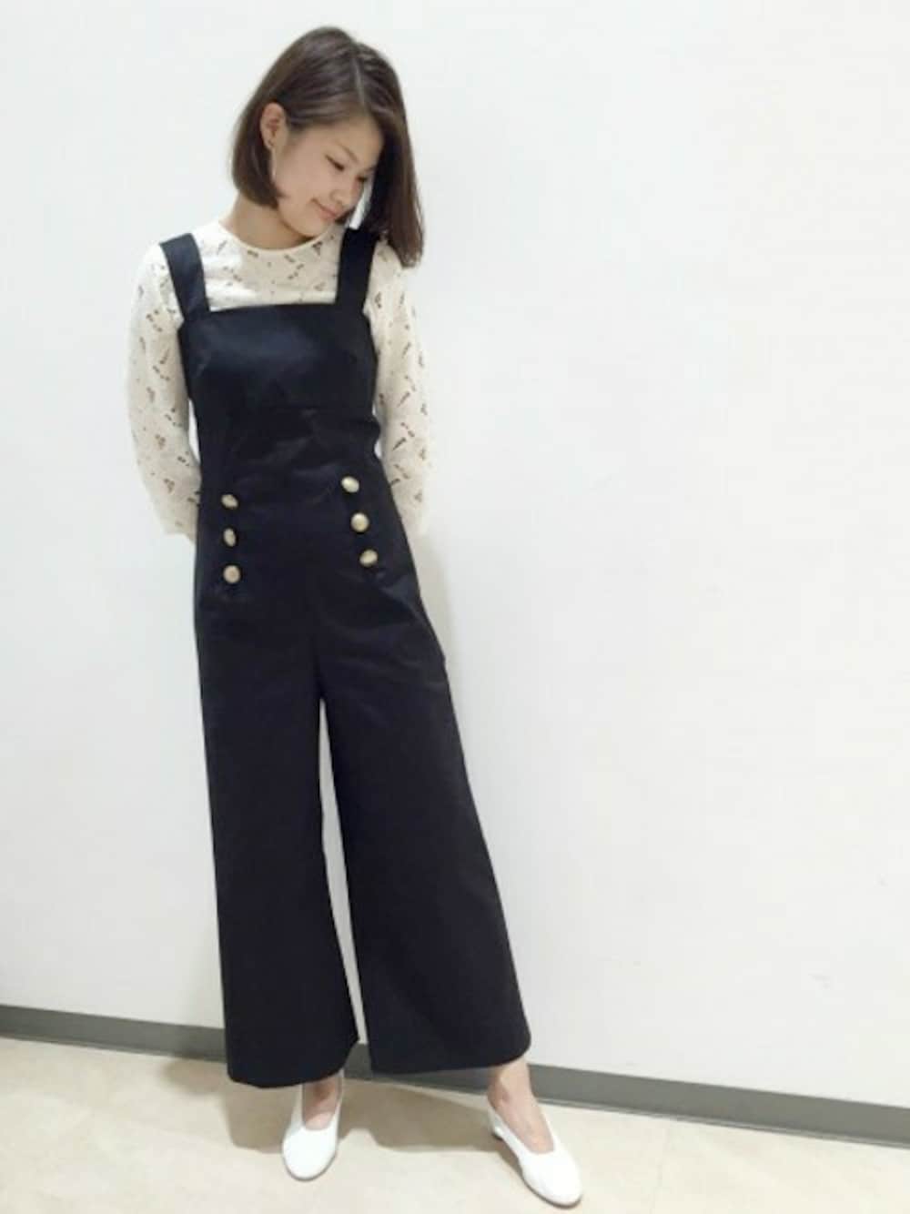 大人なマリンスタイルが叶うサロペット。 レースブラウスをインして、女性らしく仕上げ。