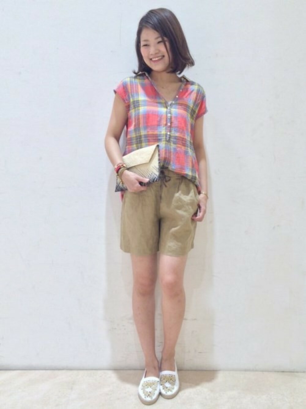 涼しげなチェックシャツをリネンのショートパンツと合わせた夏のカジュアルスタイル♪