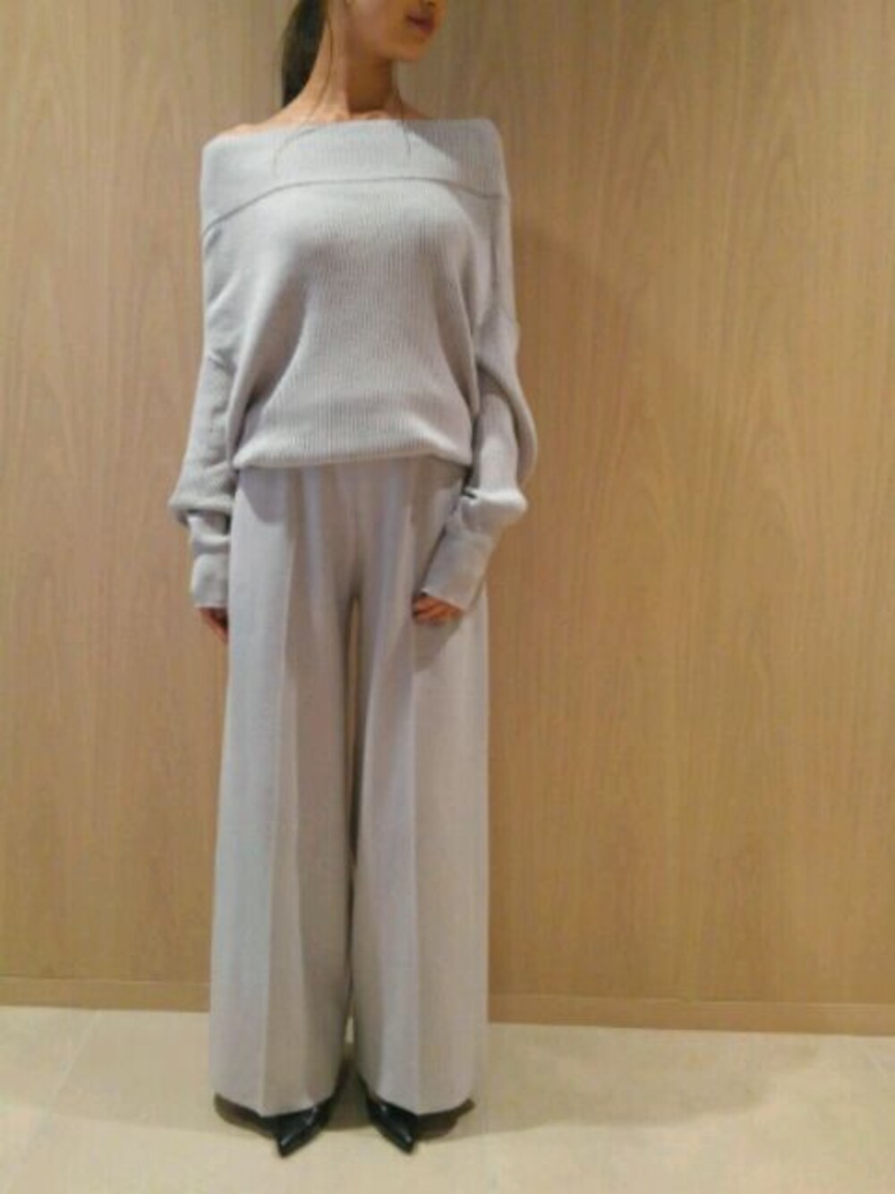 オフショルにもなる、ハイネックのドルマンニットとパンツのセットアップ。 カシミヤ入りでとってもなめらかな肌ざわりです😊✨