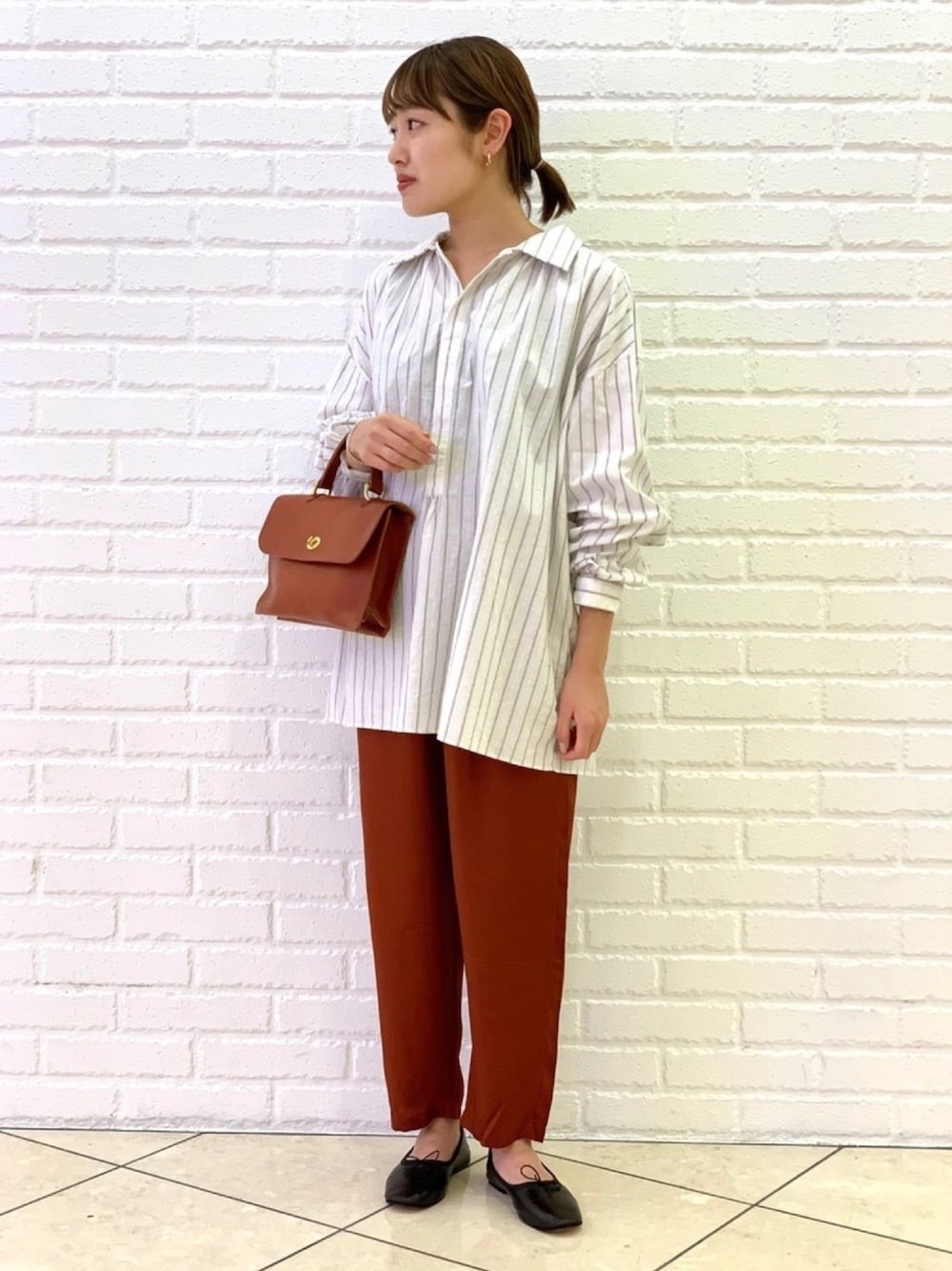 ORCIVALのブラウスは柔らかくこれからの季節に大活躍! まだまだ暑い日が続きますが、バッグとパンツで秋らしさをプラスしました。