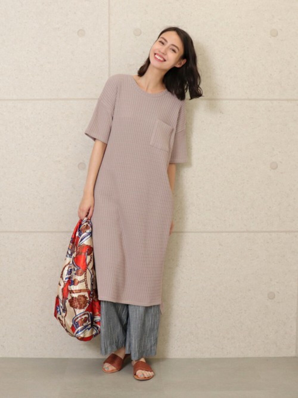 ワッフルビッグTワンピをストライプパンツとレイヤード