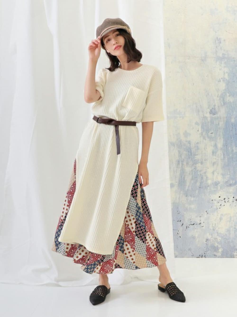 スリットTワンピを柄スカートとレイヤード。