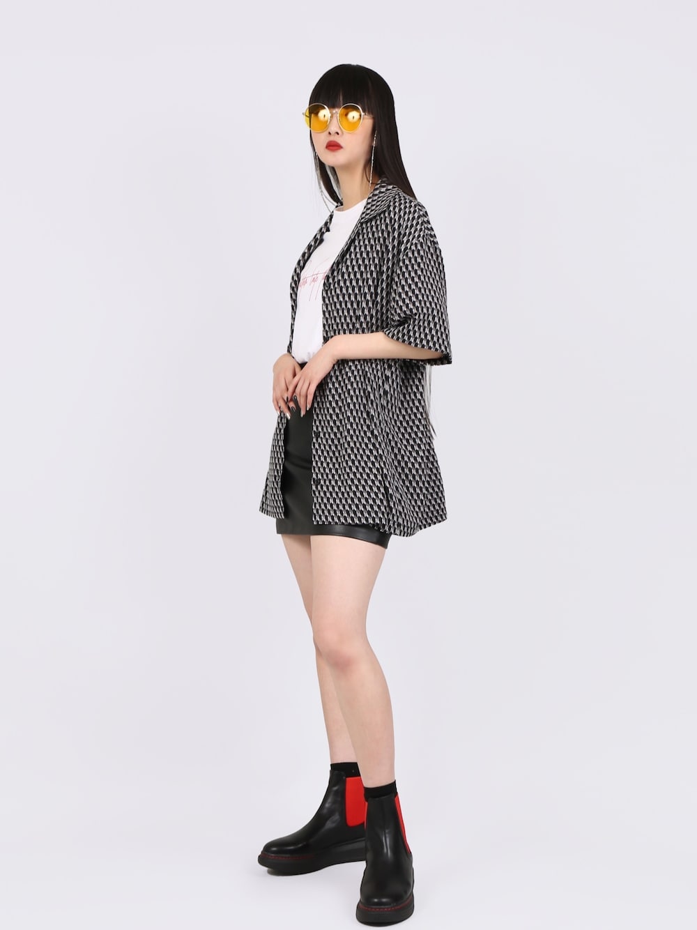 オールオーバープリントシャツ color: green,gray size: small,medium レタリングTシャツ color: white,red,gray,black size: free メタリックミニスカパン color: brown,black size: small,medium バイカラーサイドゴアブーツ color: black size: small,medium