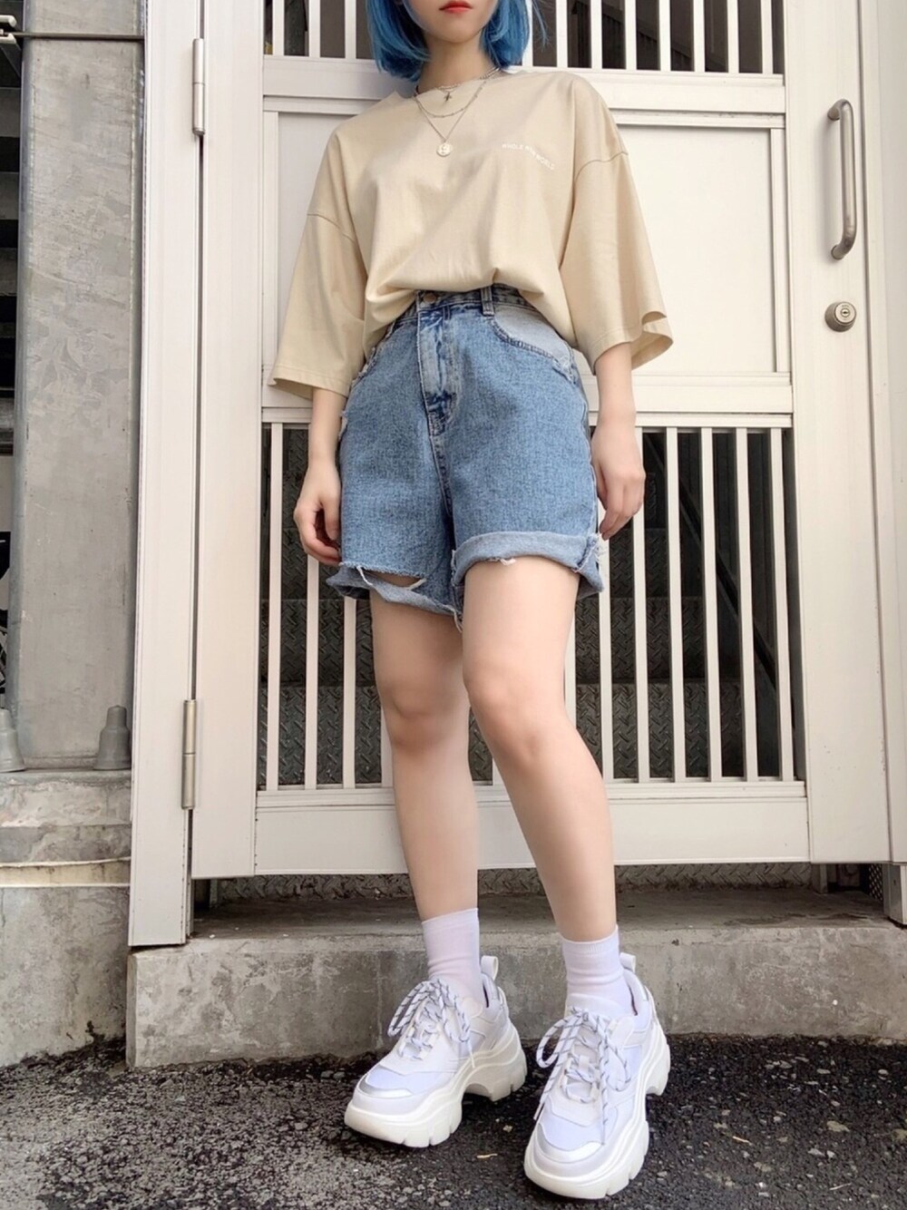 WHOLE NEW WORLD Tシャツ color: beige,green,white size: free ダメージデニムショートパンツ color: indigo blue size: small,medium プラットフォームスニーカー color: off-white,white,black size: small,medium クロスコイン4連ネックレス color: silver size: free