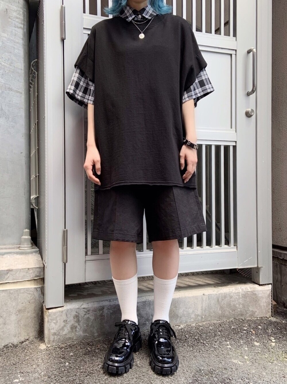 タータンチェックシャツ color: green,gray,black size: small,medium スリーブレストップス color: yellow,white,black size: free センタープレスハーフパンツ color: off-white,black size: free ボリュームソールシューズ color: black size: small,medium クロスコイン4連ネックレス color: silver size: free