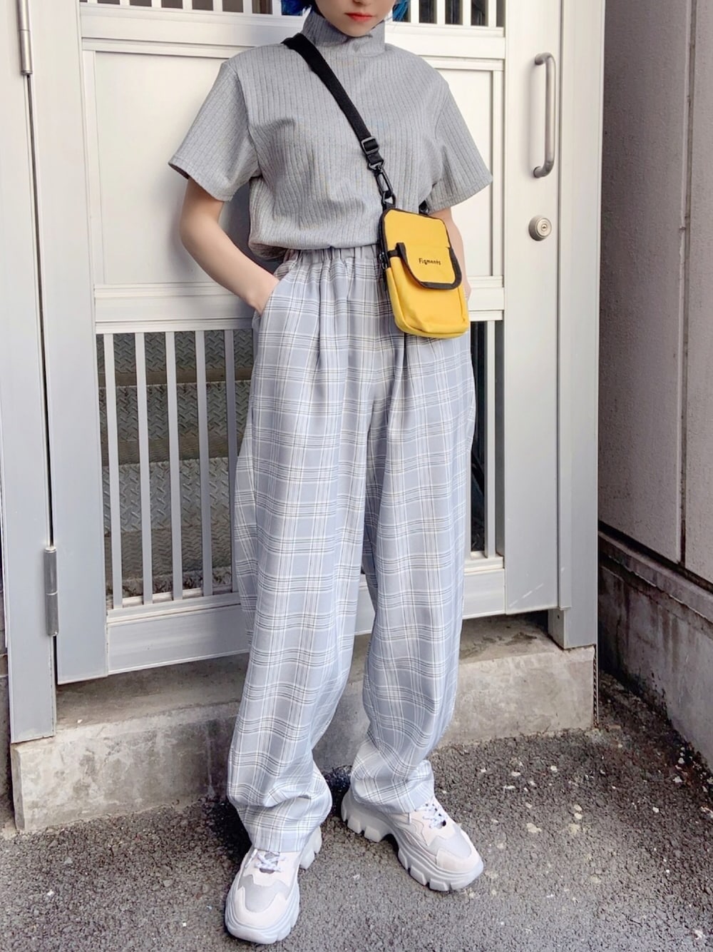 ラメハイネックTシャツ color: gray size: free タータンチェックイージーパンツ color: gray size: free ボリュームソールスニーカー color: gray,black size: small,medium ミニショルダーバッグ color: yellow,blue,black size: free