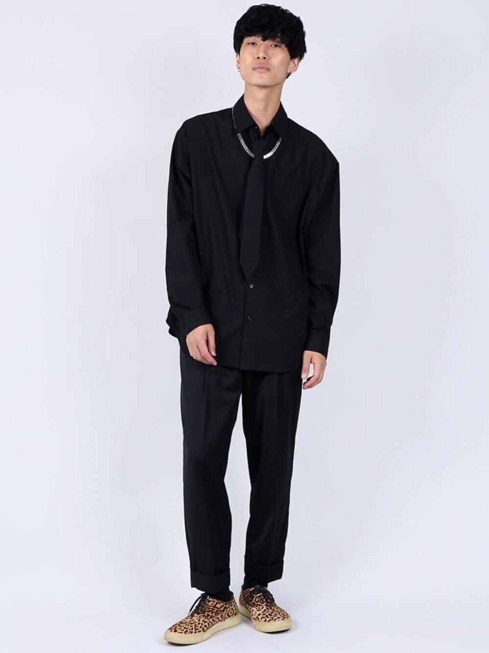 タイ付きシャツ color: white, black size: small, medium クロップドスラックスパンツ color: red, green, black size: small, medium チェーンネックレス color: silver size: free