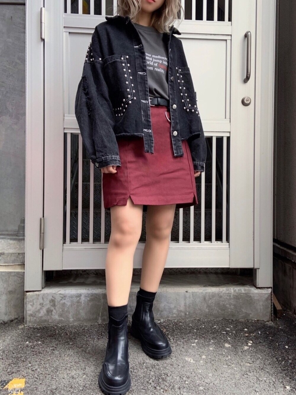 スタッズデニムジャケット color: black size: free Message Tシャツ color: blue,beige,charcoal size: free 切り替えスリットスカート color: wine,black size: free デザインショートブーツ color: black size: small,medium リングチャームベルト color: black size: free