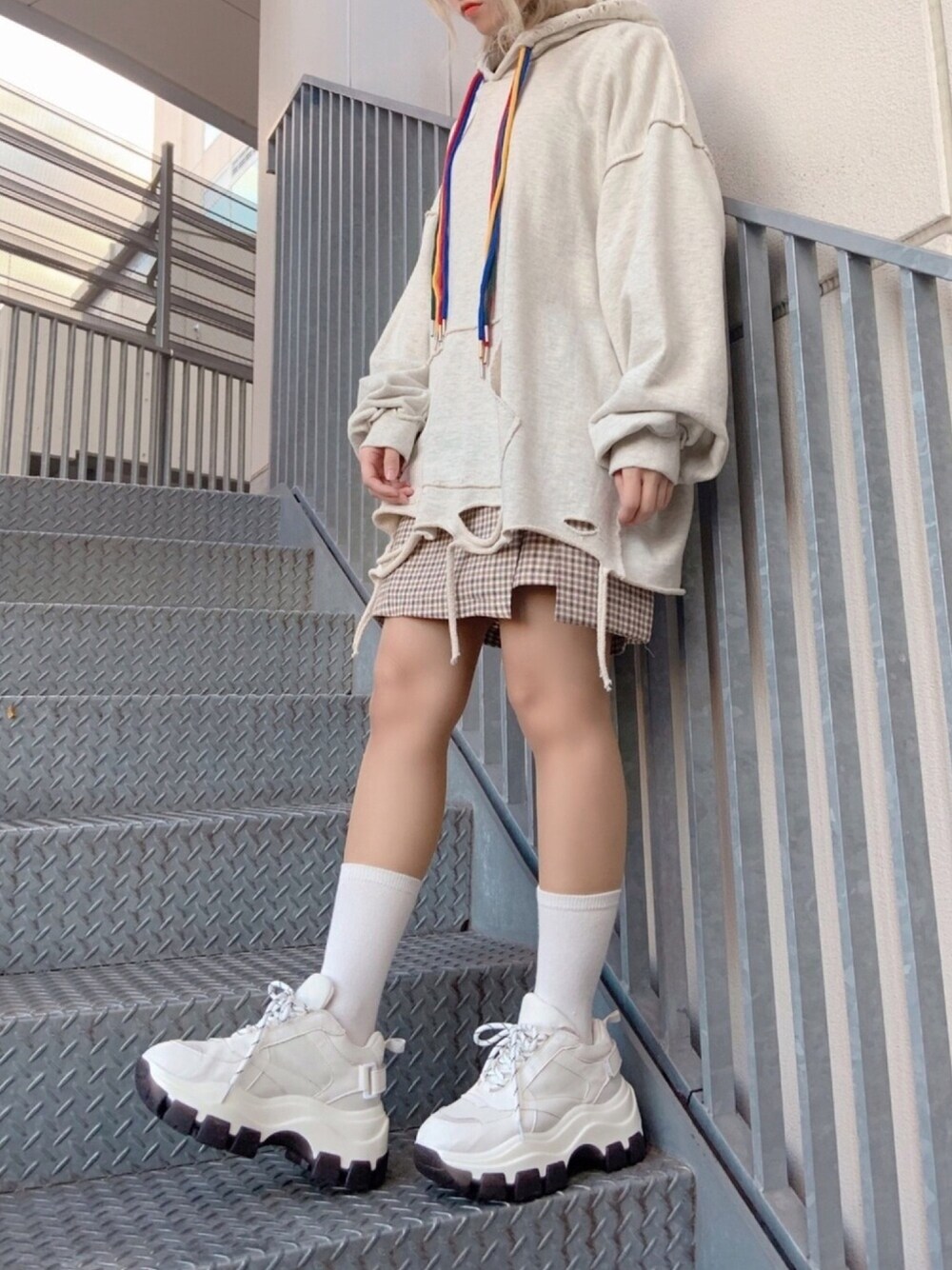 ダメージパーカー color: oatmeal, gray, black size: free チェック柄スリットスカート color: light beige, dark beige size: free プラットフォームスニーカー color: off-white, white, black size: small, medium