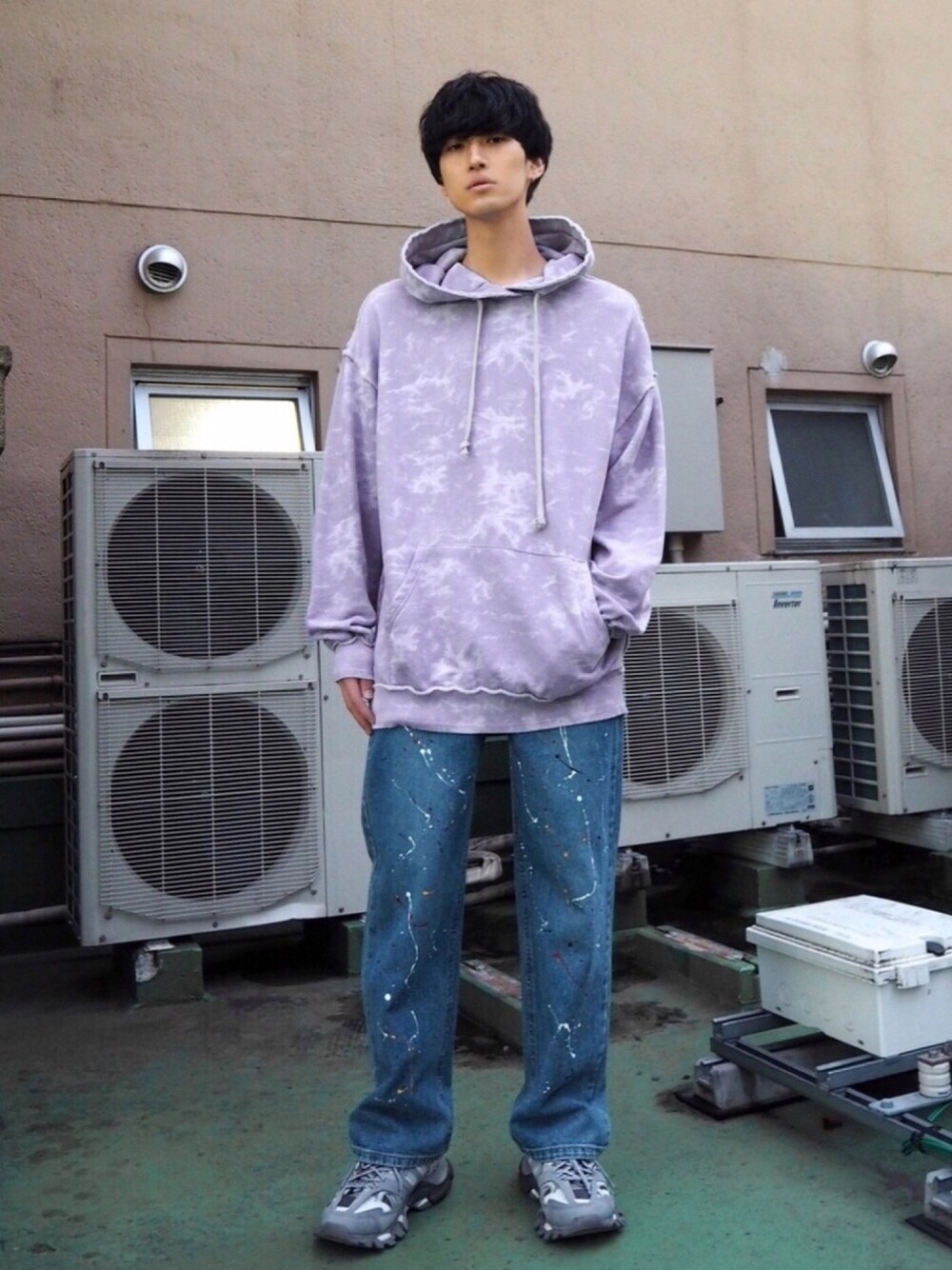 タイダイパーカー color: gray, black size: free ペイントデニムパンツ color: indigo blue size: small, medium