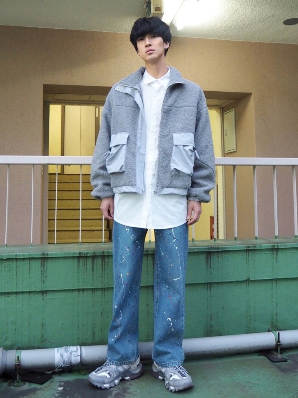 オーバーボアブルゾン color: off-white, gray, black size: free グラフティロゴシャツ color: white, black size: small, medium ペイントデニムパンツ color: indigo blue size: small, medium
