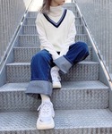 チルデンベスト color: blue, white size: free ハイネックロンT color: white, black size: free カラーブロックデニムパンツ color: indigo blue size: small プラットフォームスニーカー color: off-white, white, black size: small(23.5), medium(24.5)