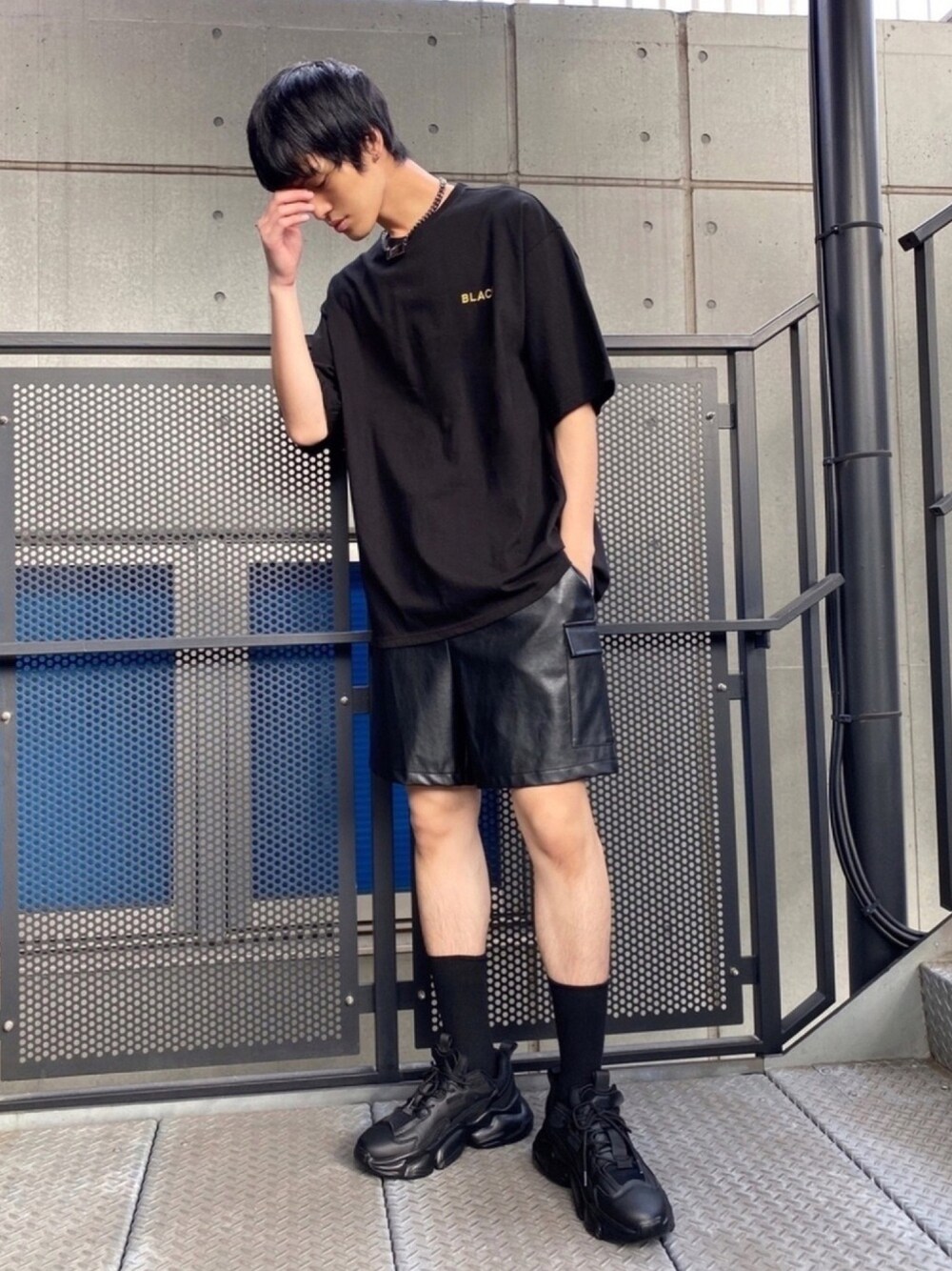 カラーネームTシャツ color: yellow, black size: free フェイクレザーショートパンツ color: off-white, black size: small, medium ボリュームスニーカー color: white, black size: small(26.5), medium(27), large(27.5) サイドリリースバックルネックレス color: black size: free