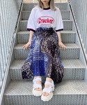 CrackerリンガーTシャツ color: white, gray size: free バンダナ柄プリーツロングスカート color: blue size: free スポーツサンダル color: white, black size: small(23.5), medium(24.5)