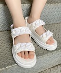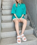 ワンポイントロゴTシャツ color: blue, green, white, black size: small, medium フェイクレザーショートパンツ color: off-white, black size: small, medium チェーンサンダル color: white, black size: small(23.5), medium(24.5) キヘイ&ケーブルチェーンキーネックレス color: silver size: free