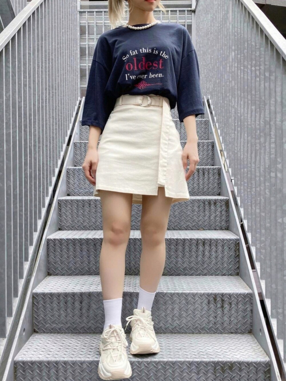 oldest ロゴT color: navy, white size: free ベルト付きスリットスカート color: off-white, black size: free UGLYスニーカー color: off-white, black size: small(23.5), medium(24.5) チェーンパールネックレス color: white size: free