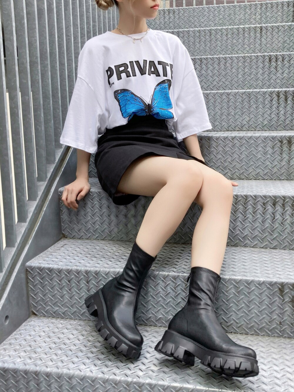 バタフライTシャツ color: white, black size: free サイドスリットスカパン color: black size: free フィットショートブーツ color: black size: small(23.5), medium(24.5) キヘイ&ケーブルチェーンオーバルネックレス color: silver size: free