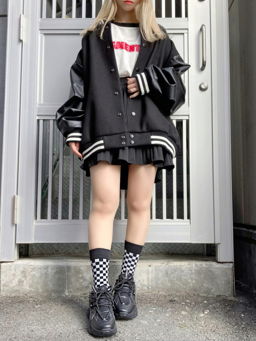 オーバースタジャン color: off-white,black size: small, medium コミックロゴラグランTシャツ color: green, blue, red size: free クリスタルプリーツフレアミニスカート color: green, black size: free ボリュームスニーカー color: white, black size: small(23.5), medium(24.5) クルーチェッカーソックス color: white, black size: free