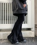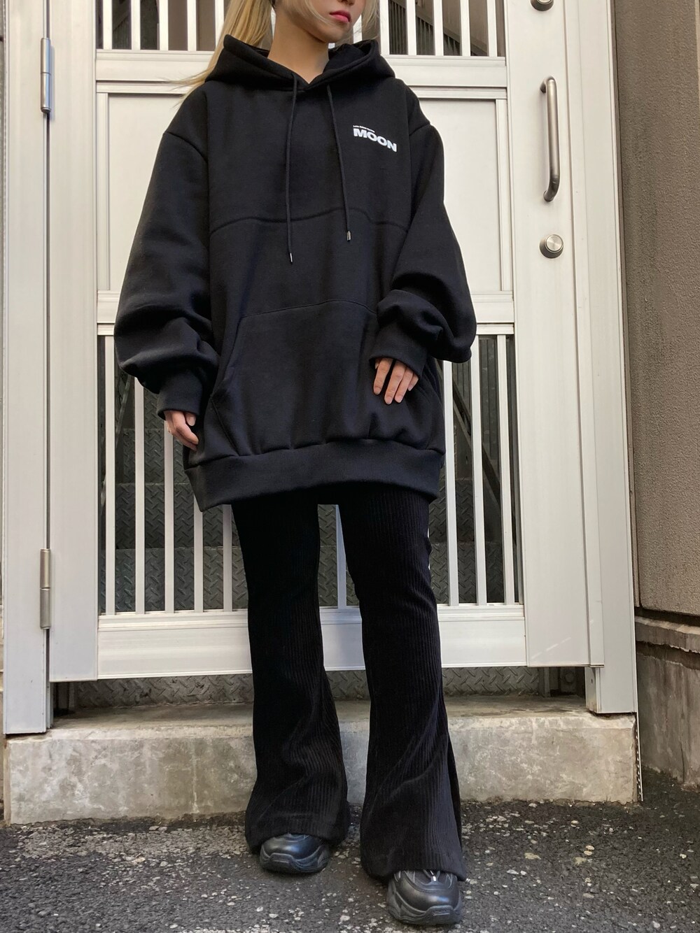 MOONパーカー color: light gray, black size: free サイドスリットコーデュロイフレアパンツ color: black size: free フューチャリスティックスニーカー color: white, black size: small(23.5), medium(24.5)