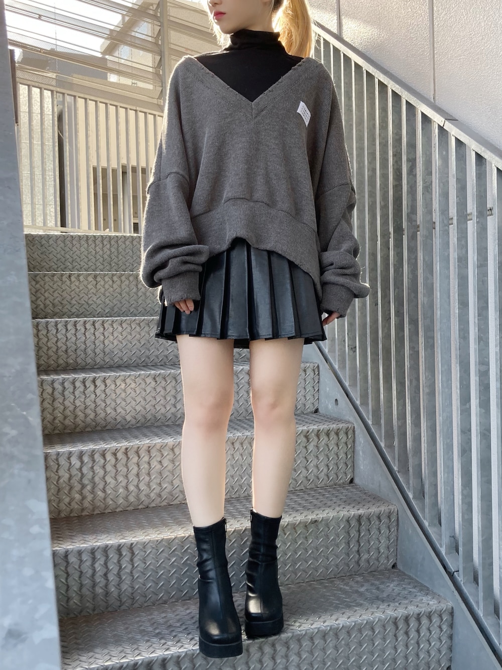 ドロップショルダーVネックセーター color: gray, black size: free ハイネックカットソー color: white, black size: free フェイクレザープリーツミニスカート color: black size: small, medium ヒールスクエアトゥブーツ color: off-white, black size: small(23.5), medium(24.5)