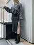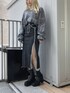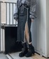 クロップドタイダイスウェット color: purple, black size: free 2Dスリットデニムスカート color: black size: small, medium ヒールスクエアトゥブーツ color: black size: small(23.5), medium(24.5) ダブルチェーンネックレス2 color: silver size: free