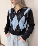 襟付きアーガイルニット color: blue, white size: free ダメージワイドデニムパンツ color: light indigo blue, indigo blue size: small, medium UGLYスニーカー color: off-white, black size: small(23.5), medium(24.5) フラワーネックレス color: silver size: free