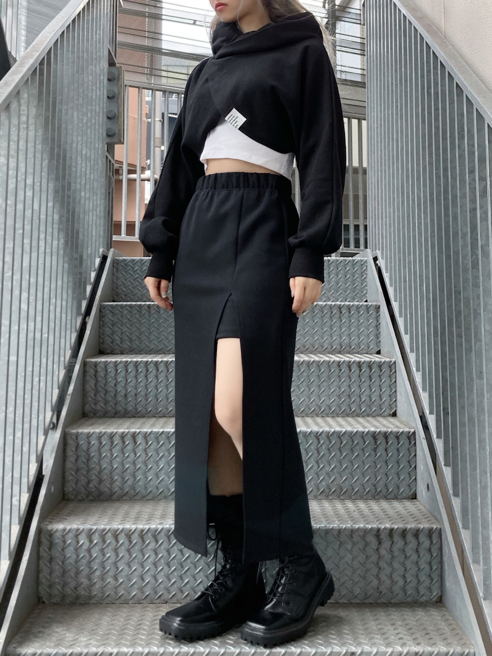 ボレロパーカー color: white, gray, black size: free スリットロングスカート color: black size free ホルターネックキャミソール color: white, black size: free レースアップスクエアトゥブーツ color: black size: small(23.5)/ medium(24.5)