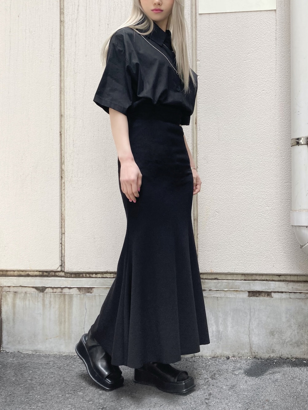 半袖シャツ color: white, black size: free リブマーメイドスカート color: gray, black size: free オープントゥサンダル color: off-white, black size: small(23.5), medium(24.5) ボールチェーンネックレス color: silver size: free