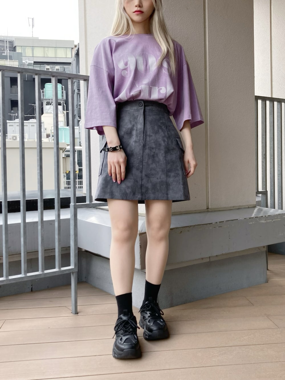 90's GirlロゴTシャツ color: purple, charcoal size: free タイダイカーゴミニスカート color: black size: free ハトメブレスレット color: black size: free プラットフォームスニーカー color: off-white, black size: small(23.5), medium(24.5)