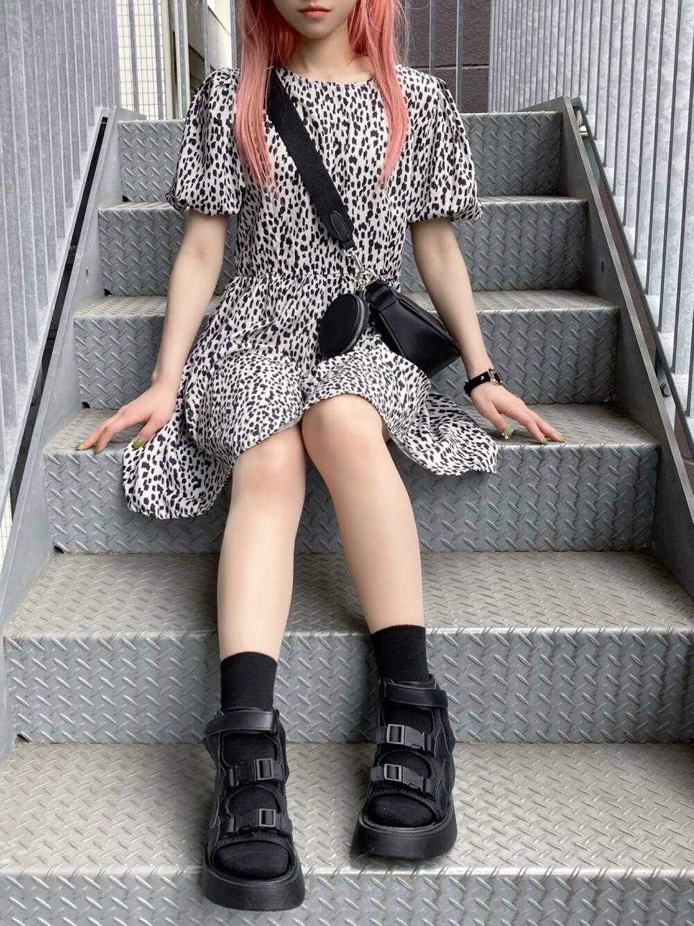 レオパードミニワンピース color: leopard size: free ナイロンショルダーバッグ color: off-white, black size: free ベルトサンダル color: white, black size: small(23.5), medium(24.5)