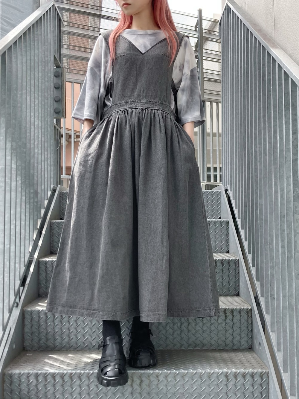ジャンパースカート color: black size: free タイダイTシャツ color: blue, purple, black size: free グルカサンダル color: black size: small(23.5), medium(24.5)
