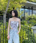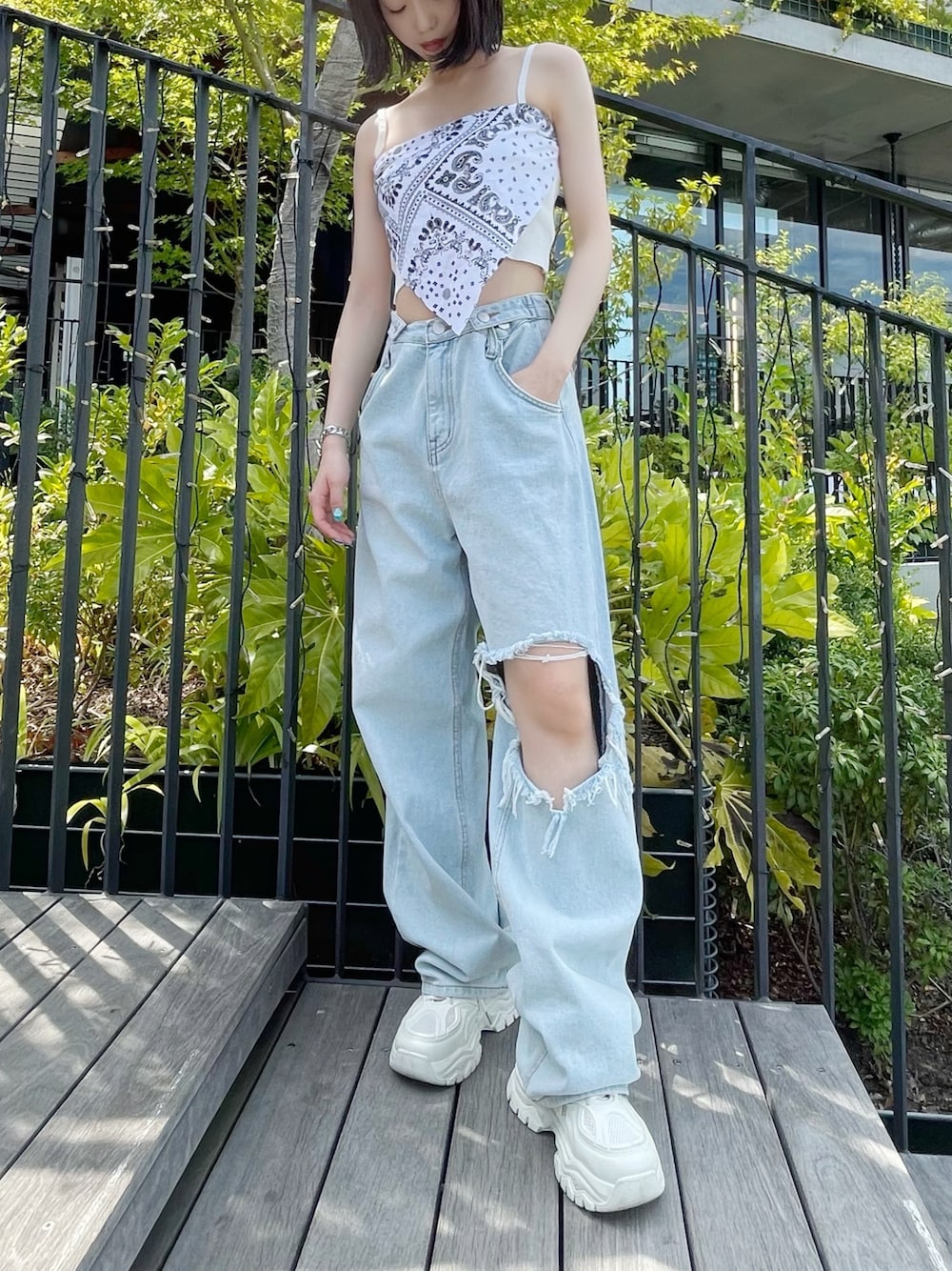 バンダナ柄キャミソール color: white, navy size: free ダメージワイドデニムパンツ color: light indigo blue, indigo blue size: small, medium プラットフォームスニーカー color: black, white size: small, medium