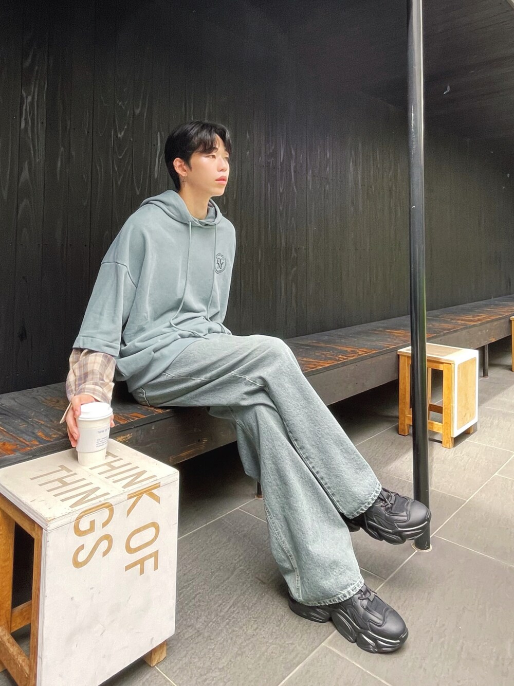 フェイクレイヤードパーカー color: green, purple, black size: large, X-large ボリュームスニーカー color: white, black size: small, medium, large