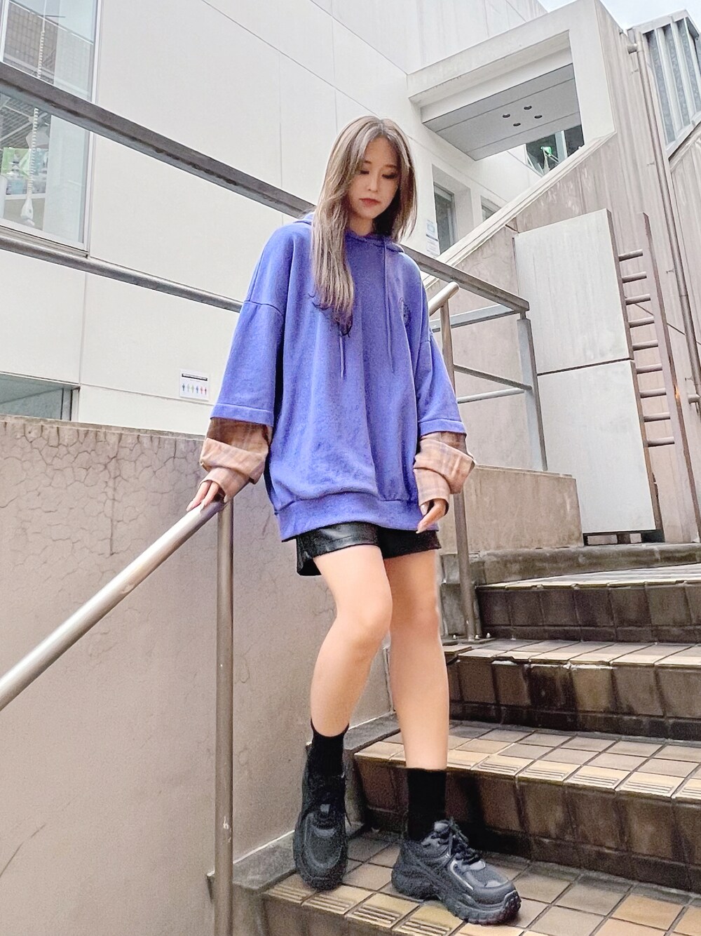 フェイクレイヤードパーカー color:purple,black,green size:large,X-large フェイクレザーショートパンツ color:black,white size: free UGLYソールスニーカー color:black size:small,medium