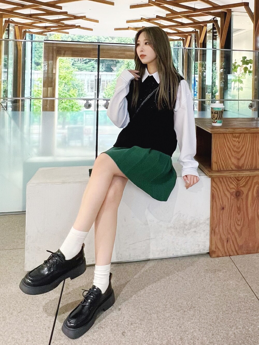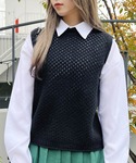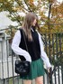 メッシュニットベスト color: off-white, black size: free ステッチシャツ color: white, black size: free ニットプリーツミニスカート color: green, gray, black size: free ヴィンテージライクショルダーバッグ color: off-white, black size: free スクエアレースアップシューズ color: white, black size: small(23.5), medium(24.5)