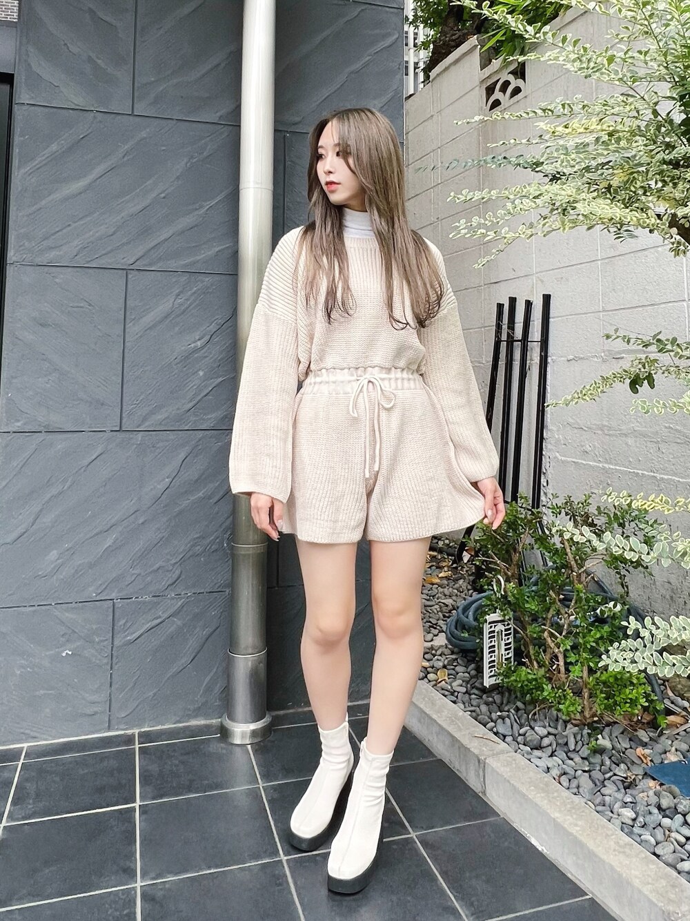 ニットジャンプスーツ color: beige, black size: free ヒールスクエアトゥブーツ color: off-white, black size: small(23.5), medium(24.5)