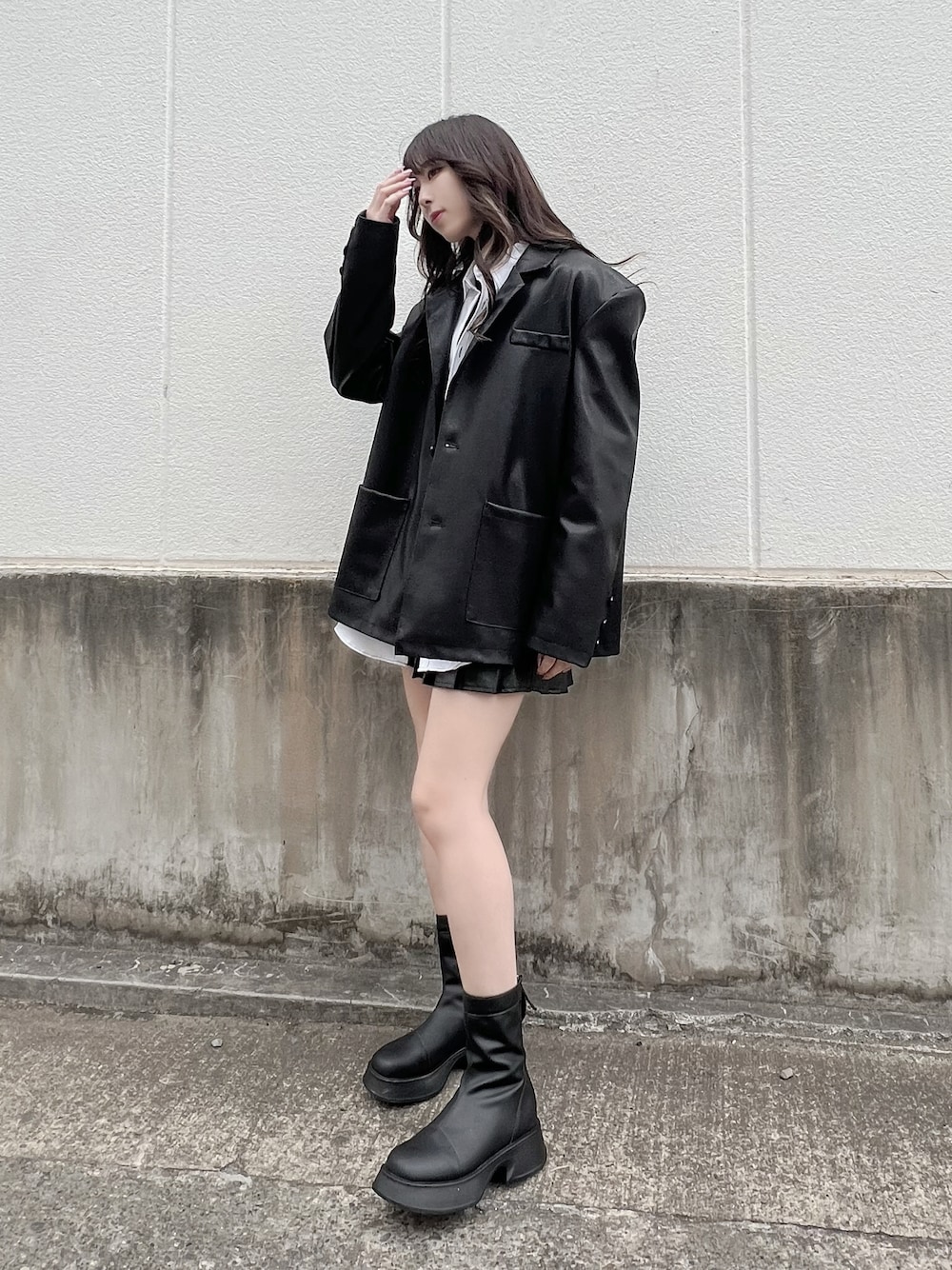 フェイクレザーテーラードジャケット color: black size: free ステッチシャツ color: white, black size: free オーバーステッチチビTシャツ color: black, white size: free フェイクレザープリーツミニスカート color: black size: small, medium フィットブーツ color: black size: small(23.5), medium(24.5)